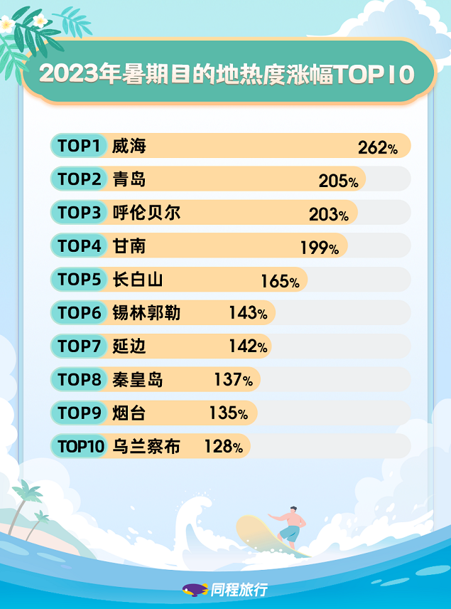 深受年轻群体喜爱的音乐节、演唱会,则成为这个暑期移动的爆款制造机——音乐节开到哪里,年轻游客就会涌向哪里。同程旅行数据显示,6月至7月,“音乐节”相关旅游搜索热度环比涨幅达到460%。此外,适宜玩水的海边和气候凉爽的草原是夏季最热门的避暑目的地,威海、青岛、呼伦贝尔等城市暑期旅游热度环比上涨超过200%。