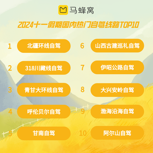 利用全年最长假期来一次长途或是深度旅行是多数旅行者的期待。灵活舒适的自驾不仅深受家庭出游欢迎,也因能随时随地邂逅“未知惊喜”深受年轻人青睐。《我的阿勒泰》让历来都是长假热门的北疆环线自驾热度更上层楼,登上今年十一假期国内热门自驾路线榜首,用自驾方式深入山西、探访古建也因近期黑神话的热度榜上有名。