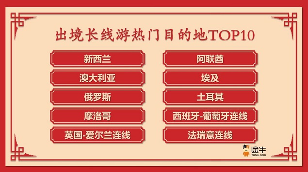 出境长线游方面,新西兰、阿联酋、澳大利亚、埃及、俄罗斯、土耳其、摩洛哥、西班牙-葡萄牙连线、英国-爱尔兰连线、法国-瑞士-意大利连线等目的地出游热度排名靠前。出境长线游用户中,超九成用户选择了跟团游。其中,“新西兰-观鲸11日游”“英国-爱尔兰12日游”“摩洛哥10日游”“墨尔本-悉尼-黄金海岸-凯恩斯11日游”“迪拜-沙迦-阿布扎比7日游”等跟团游产品备受途牛用户青睐。