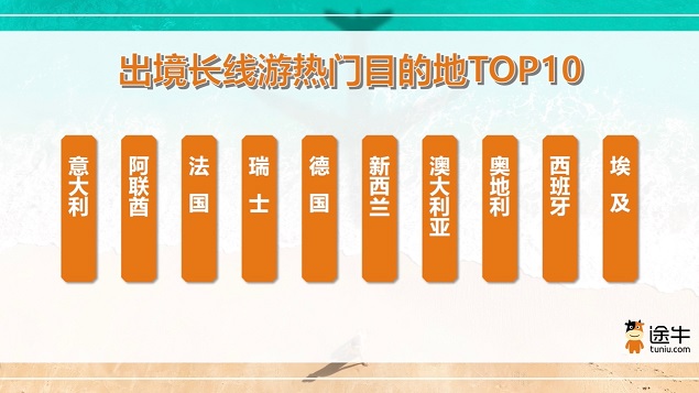 出境长线游方面,欧洲、澳新以及中东非等方向热度更高。其中,意大利、阿联酋、法国、瑞士、德国、新西兰、澳大利亚、奥地利、西班牙、埃及是途牛出境长线游用户预订的热门。