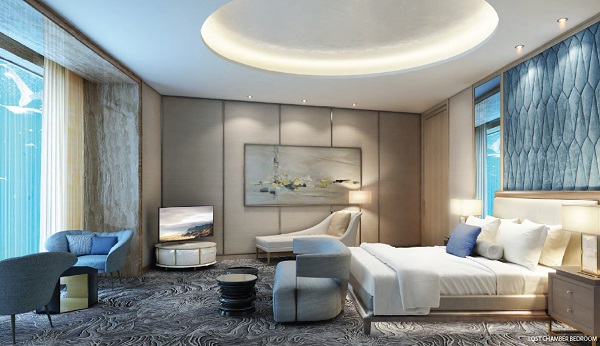 三亚•亚特兰蒂斯最令人叹为观止的当属5间宽敞奢华的水底套房。与五色斑斓的鱼群一同起居,置身于海底世界悦然休憩,水底套房将这样的梦想变为现实——86000尾海洋生物在亚特兰蒂斯水族馆的大使环礁湖中恣意游弋,而透过卧室和浴室中的落地窗,宾客即可欣赏到大使环礁湖的曼妙景致。尼普顿水底套房和波塞冬水底套房配备了尖端音响系统和高档洗浴设施,前者拥有一座12平方米的阳台,每晚售价人民币58888元,后者房型更大,内置一座33平方米的阳台,每晚售价人民币108888元。