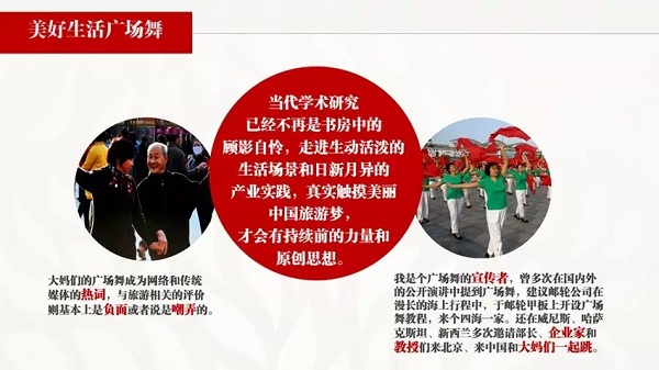 有段时间,大妈们的广场舞成为网络和传统媒体的热词,与旅游相关的评价则基本上是负面或者说是嘲弄的。比如只要有自由活动的时间和空间,也不管是在哪儿,不管别人是否侧目,大妈们打开手机播放器就能舞起来。这有什么不好吗?多数时候人们对某件事物的看法只是源于文化差异罢了。我是个广场舞的宣传者,曾多次在国内外的公开演讲中提到广场舞,建议邮轮公司在漫长的海上行程中,于邮轮甲板上开设广场舞教程,来个四海一家。还在威尼斯、哈萨克斯坦、新西兰多次邀请部长、企业家和教授们来北京、来中国和大妈们一起跳。只有零距离接触普普通通的中国人,了解他们日常生活的喜怒哀乐,而不是看电视和网络,看景区和剧场,才能真正理解什么是中国梦,什么是中国当代活的文化。当然,市井或者说市民文化不是当代文化的全部,更不是研究旅游和发展战略的全部文化资源。可是我们总是把自己拔得太高,动不动就像辛弃疾那样跑到临江的亭子上,“把吴钩看了,栏杆拍遍,无人会,登临意”。再说了,如果不是恰好赶上那些风云际会的大事件,也就无法写出黄钟大吕的历史回响。元朝管道升的《我侬词》听起来很像的大张伟和花儿乐队的《嘻唰唰》——抱歉,我每次都听成了大扫除的“洗刷刷”,或者做头发的“洗剪吹”——就很适合做今天的广场舞曲啊:“把一块泥/捻一个你,塑一个我/将咱两个一齐打碎/用水调和/再捻一个你,再塑一个我/我泥中有你,你泥中有我。所以我说广场舞里有文化,有历史传统,也有现实可触的中国梦。当代旅游发展理论不是一直倡导主客共享的理念吗?不是一直强调旅游是异地生活方式的体验吗?不是强调美好生活是旅游发展新动力吗?这就需要与真实的生活相接触,真实地参与他们的生活场景中去,才会有真正意义上的了解之同情。