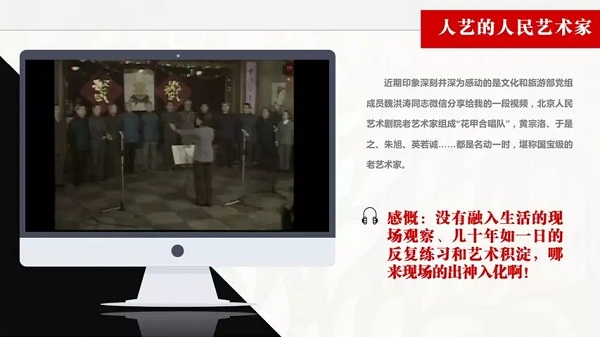 北京是文化中心,得地利之便,倒是常常有机会去剧场看京剧、昆曲、交响乐、话剧、现代舞和先锋话剧什么的,艺术享受之余,也结合学术和行政工作做了些思考。近期印象深刻并深为感动的是文化和旅游部党组成员魏洪涛同志微信分享给我的一段视频,北京人民艺术剧院老艺术家组成“花甲合唱队”,黄宗洛、于是之、朱旭、英若诚……都是名动一时,堪称国宝级的老艺术家。从画面看,应该是上个世纪九十年代的某次文艺界迎春晚会的演出,曲目是无伴奏合唱《叫卖组曲》。艺术家逐一演绎了商贩叫卖烧饼、豆腐、蔬菜、冰激凌、柿子、花卉、金鱼、报纸,还有收废品、锯锅补碗的市井声音。一时恍兮惚兮,直觉万千生活入梦来,却又那么清净。反复听了几遍,不由得感慨万千:没有融入生活的现场观察、几十年如一日的反复练习和艺术积淀,哪来现场的出神入化啊! 什么叫来源于生活,又高于生活,这就是。没有走村串乡的周朝采诗官,没有煮茶招待说故事路人的蒲松龄,就不会有“经典咏流传”的《诗经》,就不会有国人津津乐道的《聊斋志异》。