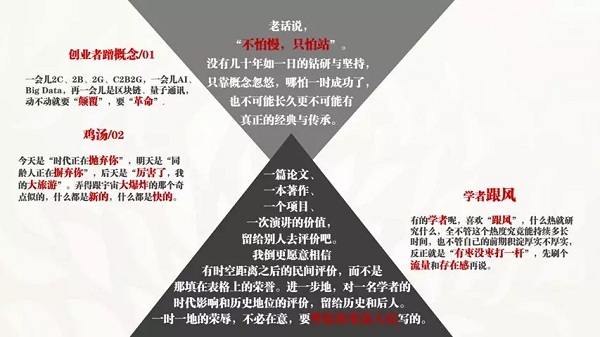 现在有的创业者喜欢“蹭概念”,一会儿2C、2B、2G、C2B2G,一会儿AI、Big Data,再一会儿是区块链、量子通讯,动不动就要“颠覆”,要“革命”。旅游业的市场创新和产业升级固然需要理念、科技和创业激情的推动,但是每天都在谈论新的概念,贩卖假似是而非的“鸡汤”,今天是“时代正在抛弃你”,明天是“同龄人正在摒弃你”,后天是“厉害了,我的大旅游”。弄得跟宇宙大爆炸的那个奇点似的,什么都是新的,什么都是快的。这正常吗?我们太浮躁了,以至于不能静下心踏踏实实地做事情,更忘记了“太阳底下无新事”的常识。上个月我在研究院的旅游文献中心一些年轻人开了一个闭门会,聊了聊关于区块链旅游的概念、前景与可能的商业,结论性的意见也在网上公开了。核心观点就是创业者不能浮躁,不能老是跟着“概念”走,更不能总想着吃巧食。消费者不是傻子,能进到同一个圈子的人,在同一个层面说话的人更不可能是弱智,况且还有法治和政府监管呢。我看还是做阳光下生意,赚说得清楚的钱为好。除非乔布斯这样的商业天才,绝大多数的企业家和经理人还是扎扎实实地做产品和质控。老话说,“不怕慢,只怕站”。没有几十年如一日的钻研与坚持,只靠概念忽悠,哪怕一时成功了,也不可能长久更不可能有的真正的经典与传承。