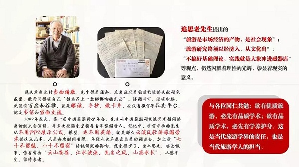 清明节值班期间整理文献,展阅申葆嘉先生关于旅游研究几个问题的亲笔来信,起首是“戴斌学棣”,古风跃然纸上,不由静思半晌。先生就读于西南联大,后任教于南开大学,长期从事旅游基础理论研究,是我国旅游学科奠基人和第一代旅游学人的代表。1996年,我在南开大学读到《旅游学刊》连载五期的《国外旅游研究进展》,高山仰止,竟生出“才情有限,无力再做基础理论,还是老老实实地搞自己的产业经济和企业管理吧”之感叹。携文章赴北村当面请教,先生很是谦逊,反复说只是钻故纸堆的文献研究成果,做学问得有自己“往桌子上一放梆梆响的东西”。环顾斗室,没有电脑,更没有百度和谷歌,就是眼读、手抄、做卡片,也没有微信等社交平台,就是书信和当面交流。正是这样“当时只道是寻常”的喝茶、聊天和争论,一批又一批青年学子感受到了什么是“谦谦君子,温润如玉”。2009年春天,第一届中国旅游科学年会,先生以中国旅游研究院学术顾问的身份做大会演讲,并多次受邀来京指导青年旅游学人。记忆中,学贯中西的先生从不用PPT展示公式、模型,也不用英语,就是那么云淡风轻讲旅游学术的这点儿事。只是每次时间有限,年轻人也不愿意总是回顾过去,加上受“七十不留饭、八十不留宿”传统讲究的影响,就来得少了。至今思来,亦为憾事,惟有常念“云山苍苍,江水泱泱。先生之风,山高水长”,以慰平生,留待来者。