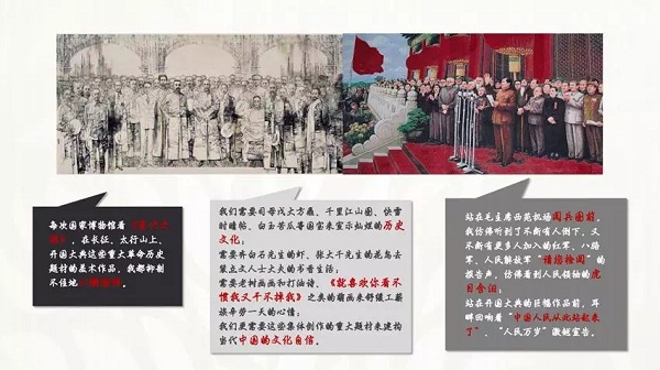 每次国家博物馆看《复兴之路》,在长征、太行山上、开国大典这些重大革命历史题材的美术作品,我都抑制不住地心潮澎湃:我们需要司母戊大方鼎、千里江山图、快雪时晴帖、白玉苦瓜等国宝来宣示灿烂的历史文化,需要齐白石先生的虾、张大千先生的花鸟去装点文人士大夫的书香生活,需要老树画画和打油诗、《就喜欢你看不惯我又干不掉我》之类的萌画来舒缓工薪族辛劳一天的心情,我们更需要这些集体创作的重大题材来建构当代中国的文化自信。站在辛亥革命以来的仁人志士群像前,我会觉得自己身上的文人士大夫的功名思想是如此渺小;站在毛主席西苑机场阅兵图前,我仿佛听到了不断有人倒下,又不断有更多人加入的红军、八路军、人民解放军“请您检阅”的报告声,仿佛看到人民领袖的虎目含泪;站在开国大典的巨幅作品前,耳畔回响着“中国人民从此站起来了”、“人民万岁”激越宣告。事实上,类似承载民族记忆和国家价值的宏大叙事,在俄罗斯、美国、英国、日本的国立博物馆、美术馆、艺术馆都有陈列。