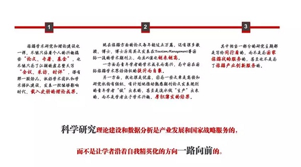 旅游学术研究和理论建设也一样,不能只依着个人的兴趣搞些“论文、专著、基金”,也不能只为了江湖的虚名整天写“会议、采访、时评”,得有那一股劲儿,抓好学术团队和学术梯队建设,发表一批能够影响时代、载入史册的理论成果。诗三百,风、雅、颂各有所长,也各有所爱。总体而言,还是喜欢风的人多,很少会有人出口成颂的。可是真要读进去的话,就像观看国博的重大历史题材馆那样,会碰到中国文化体系中最坚硬的内核。现在旅游方面的论文每年超过五万篇,还有很多教授、博士、博士后用英文发表在Tourism Management等国际一流的学术期刊上,而且H值也越来越高。一方面为青年学者的学术成长而高兴,为中国在国际旅游学术界话语权的提升而自豪。另一方面,我也很是忧虑,因为一些文章是高校和研究机构有组织、有计划地推动熟悉期刊论文发表规则的青年学者“做”出来的,甚至是流水线“生产”出来的,而不是学者出于学术兴趣,厚积薄发的结果。其中相当一部分的研究主题都是写给同行看的,而不是为国家旅游战略服务的,甚至也不是为了旅游产业创新服务的。如果导向出了问题,思想被悬置,只余下技术和学术,长此以往,可怎么行啊!金融是为实体服务的,所以国家反对金融业一味地“脱实向虚”。房子是用来住的,所以国家要抑制房地产业的投机炒作。科学研究、理论建设和数据分析是产业发展和国家战略服务的,而不是让学者沿着自我精英化的方向一路向前的。如果我们不能与千千万万的游客和员工在一起,不能想他们之所想,急他们之急,以知识分子的才情和科学家的努力让他们享受美好的旅游生活,获得应有的职业尊严,哪怕再多的荣誉,也终将失去人民的信任,终将为历史所忘却。