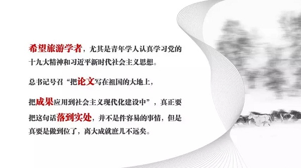 坐而论道固然可以气象万千,但是真要扭转乾坤的话,非得起而行之。行什么?行国家战略所需。脱离了国家战略和产业支撑,学者的自我精英化也是走不远的。希望旅游学者,尤其是青年学人认真学习党的十九大精神和习近平新时代社会主义思想。总书记号召“把论文写在祖国的大地上,把成果应用到社会主义现代化建设中”,真正要把这句话落到实处,并不是件容易的事情,但是真要是做到位了,离大成就庶几不远矣。