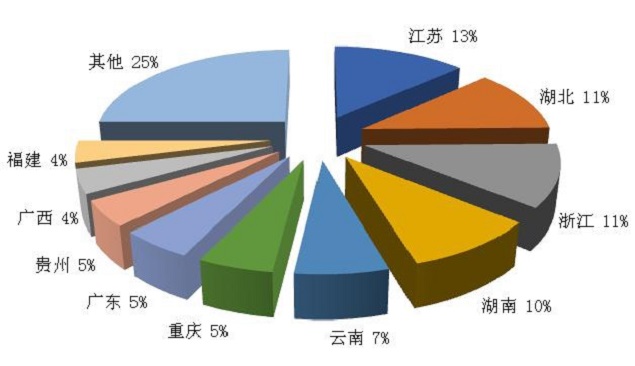 第二季度旅行社国内旅游接待人次排名前十位的地区由高到低依次为江苏、湖北、浙江、湖南、云南、重庆、广东、贵州、广西、福建。(见图2)