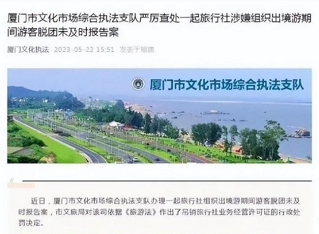 5月22日,厦门市文化市场综合执法支队办理一起旅行社组织出境游期间游客脱团未及时报告案。厦门市文旅局对该司依据《旅游法》作出了吊销旅行社业务经营许可证的行政处罚决定。