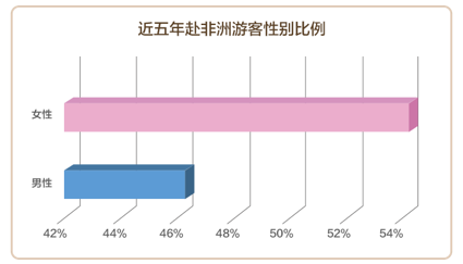 对非洲感兴趣,想要前往非洲旅游的人都是哪些人?中青旅遨游网近五年赴非游客数据表明,女性比男性更喜爱前往非洲旅游。54%是女性,46% 是男性,女性比例高8个百分点。