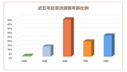 与其财富、体力、闲暇时间相匹配,70,80 后依然是出境游的中坚力量,80后占比44%,70后占比18%。70前的中老年人占比25%。但越来越多的90后对非洲旅游的兴趣也在增长,占比12%。