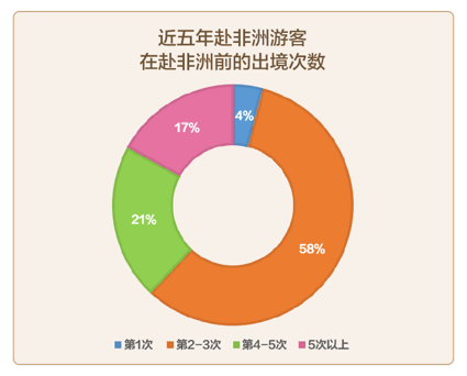 我们对近五年中青旅遨游网赴非洲游客进行了电话回访,大部分会员表示“已经玩遍了东南亚,欧美、澳洲也去过了,就想去非洲这种地方看看”,一部分学生家长表示“(海岛)孩子小时候都带着去过了,欧美名校也看过了,想带孩子多了解一下历史文明,看看文化遗产”,摄影发烧友则表示“拍动物大迁徙,就得去肯尼亚”。回访结果整体显示,大部分中青旅遨游网会员会在第2-3次出境游时选择非洲地区,占比58%,其次为第4-5次,占比21%。