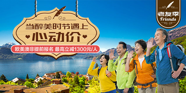 值得推荐的是“老友季”还推出三大限时优惠,可分别在现有的“早鸟报名优惠”促销力度上进行叠加使用:优惠一:“约团”福利,6人以上同时报名优惠300元/人;优惠二:“旅游敬老津贴”福利,55周岁及以上老会员享200元/人优惠;优惠三:“新品尝鲜券”福利,可领取200元/人的优惠券礼金。三大限时优惠,可分别与“早鸟报名优惠”叠加,最高立减1300元/人。欢迎广大老年朋友们,一起尝鲜、组团游全球。