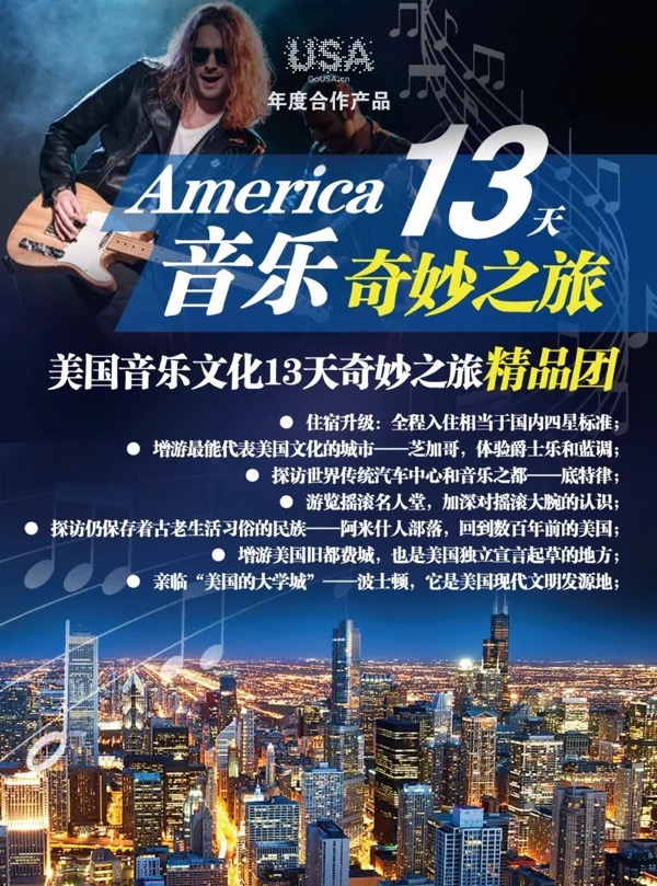 音乐即是生活。没有动人音乐,世界会怎样?美国音乐反映了美国人民的旺盛精力、多元格局、精神面貌和创造力,结合今年Brand USA的音乐之路主题,我们推出了深度探访美国音乐文化13天奇妙之旅,增游最能代表美国文化的城市——芝加哥,体验爵士乐和蓝调;探访世界传统汽车中心和音乐之都——底特律;游览摇滚名人堂,加深对摇滚大腕的认识;力求给游客最独特的美国文化体验。