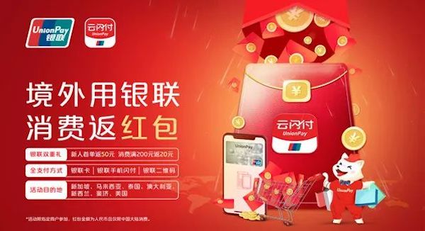 截至年底,在新加坡、日本、澳大利亚、美国等9个热门国家的4000+商户门店用中国大陆发行的银联卡/手机闪付/二维码支付满200元,可返云闪付APP20元红包;云闪付APP新用户首笔返50元红包,日韩需满200元。