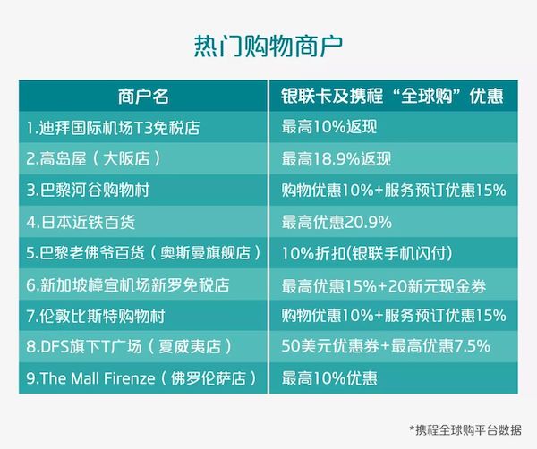“买买买”还是中国游客喜爱的项目。携程“全球购”十大最热门的购物商店都已实现银联卡受理,并都有银联卡持卡人叠加优惠。