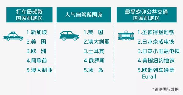 中国游客偏好用银联卡支付出租车、网约车费用,或搭乘地铁等公共交通。同时,境外20个国家和地区的租车公司支持银联卡。交通场景的银联卡优惠也非常多,例如: