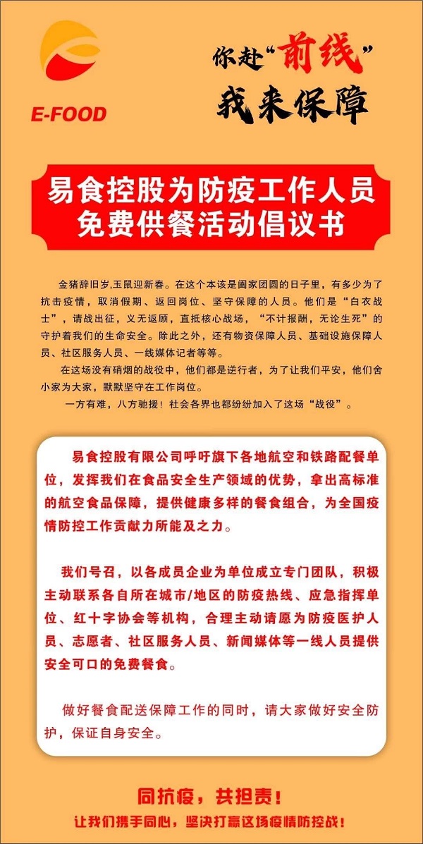 一方有难,八方驰援!凯撒旅业旗下易食控股有限公司紧急号召下属航空和铁路配餐企业,发挥在食品安全生产领域的优势,拿出高标准的航空食品保障,提供健康多样的餐食组合,为全国疫情防控工作贡献力所能及之力。
