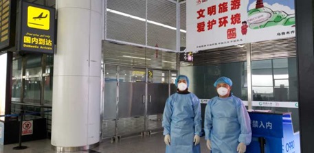 新疆航食志愿者参加疫情防控工作,在机场航站楼进出港门口,为旅客进行体温检测。