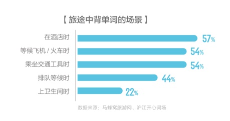 基于对马蜂窝平台大数据及沪江开心词场的数据分析,发现在平时背单词的人群中,48%的人在旅途中也会坚持背单词,其中有22%的学霸上洗手间都在背单词。