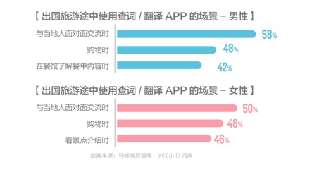 无论是男性还是女性,都因渴望向当地人表达自己,与当地人面对面交流而使用查词/翻译工具,这点在购物时也很明显。我们也发现了一些不同,男性在餐厅点餐时更多地会查词/翻译,而女性在了解目的地的文化信息方面,会更多使用查词/翻译服务。