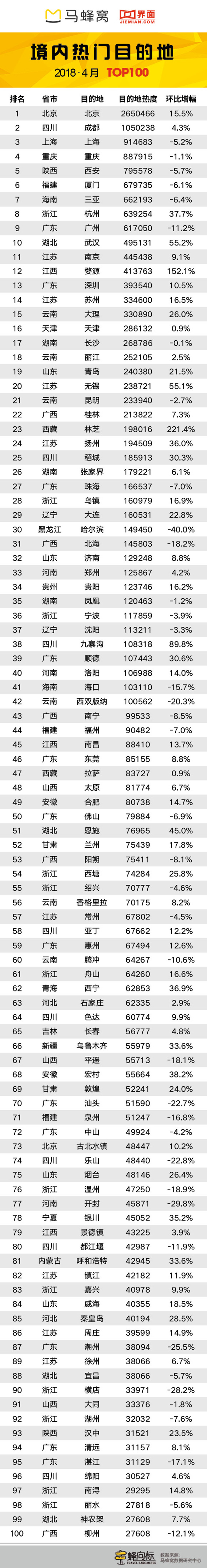 4月境内热门旅游目的地排行榜显示,排在前十的分别是北京、成都、上海、重庆、西安、厦门、三亚、杭州、广州和武汉。