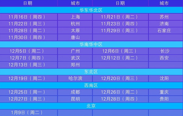 2017旅业巡回路演将于11月中开始,总计涉及19个城市,具体安排如下: