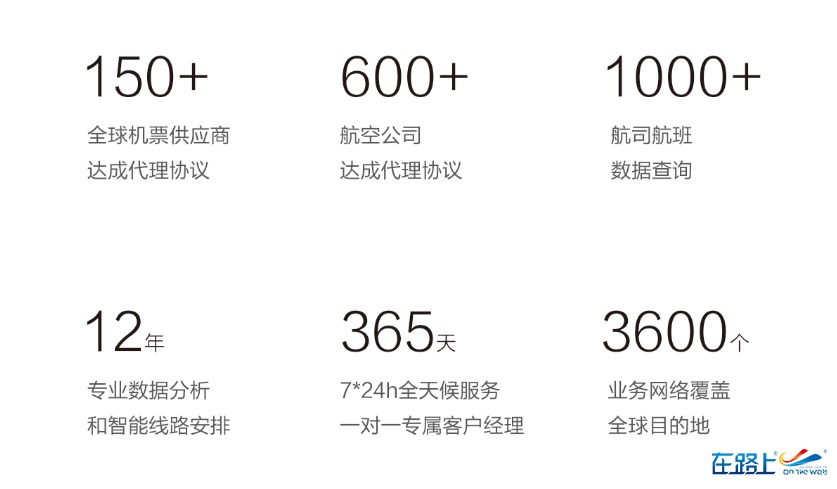 在路上大交通,作为国内领先的大交通解决方案提供商,与星空联盟、天合联盟、寰宇一家主要成员均有密切合作,十多年来荣获航空公司200多个奖项,17年获得年度最佳旅行社服务商、年度最佳大交通综合解决服务商、年度PCO TOP100金手指奖;2018年获国家旅业奖最佳旅游大交通解决方案服务商奖项。致力于为入境、出境、海外和会奖、会展、商务、游学、劳务、欧铁、邮轮客户解决一系列大交通问题,经过14年的行业沉淀,拥有数百名行程规划师,服务于上万家泛商旅客户。通过布局海外公司,已整合全球超过600家航司资源。利用大数据赋能,协助客户控制成本。以客户为中心,与客户共赢。
