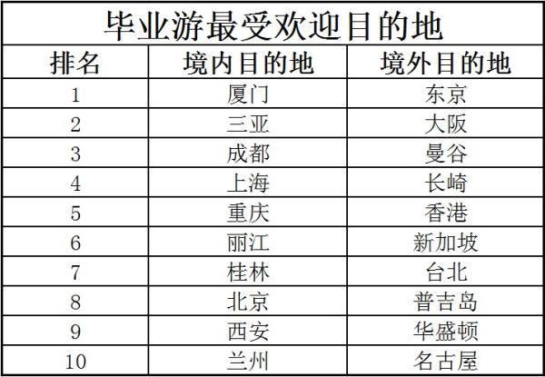 毕业游以国内为主,厦门、三亚、成都位列最受喜爱国内目的地前三,紧随其后的为上海、重庆、丽江、桂林、北京、西安、兰州。多个城市和景点因为小视频爆红,符合年轻人追求潮流、表达个性的出行主张。