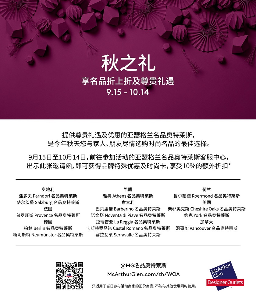 如需了解更多特惠详情,请访问 www.mcarthurglen.com/CN/WOA