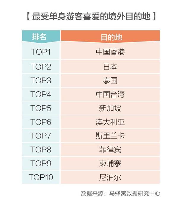境外目的地方面,中国香港、日本、泰国、中国台湾、新加坡、澳大利亚、斯里兰卡、菲律宾、柬埔寨和尼泊尔等目的地受到中国单身游客的关注。