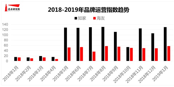 就1月运营指数表现而言,如家与海友的数据增长表现较为突出。本月如家的运营指数为129.84,海友达到57.23,两者环比增长率分别为22.39%和17.01%。