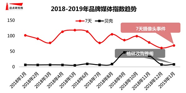 从被选取的两个经济连锁酒店品牌媒体指数变化趋势来看,7天整体强于贝壳,且前者数据波动较为均衡。1月,在媒体报道方面,两者均以被动传播为主,前者因消费者投诉而被媒介广泛关注,后者则由于集团收购事件连带影响。