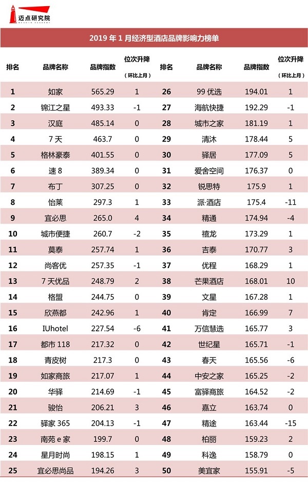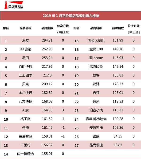 本月迈点研究院最新独家发布的“2019年1月中国住宿业经济型/平价酒店品牌影响力榜单”中,如家、锦江之星、汉庭、7天、格林豪泰、速8、布丁、怡莱、宜必思和城市便捷等成为经济型酒店品牌TOP10;平价酒店品牌前十名则分别是海友、99旅馆、易佰、百时快捷、云上四季、贝壳、金广快捷、八方快捷、A家和格子微。