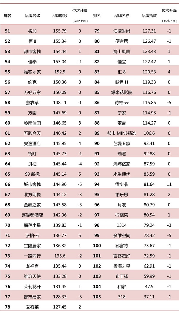 榜单内共计105家经济型酒店品牌和27家平价酒店品牌。品牌影响力上,53.79%的品牌较上月环比上涨;分别来看,54.29%的经济型酒店品牌环比上涨,51.85%的平价酒店品牌环比上涨,过半品牌数据出现上扬。品牌排名上,28.79%的品牌环比上升;分别来看,35.24%的经济型酒店品牌环比上升,3.7%的平价酒店品牌环比上升,竞争过程中彼此的差距并不明显。具体榜单如下: