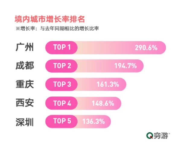 从目的地行程数来看,北上广深等一线城市成为游客出游的境内热门目的地,其中广州同期热度增长率居首位,高至290.6%。境外目的地中日本城市热度最高,大阪、东京、京都、奈良居整体排名前四。综合境内外目的地及同期增长率情况,在春节小长假后,用户更偏向距离较近的短途目的地。随着国内旅游体系的不断成熟,境内目的地受欢迎程度也将不断上升。