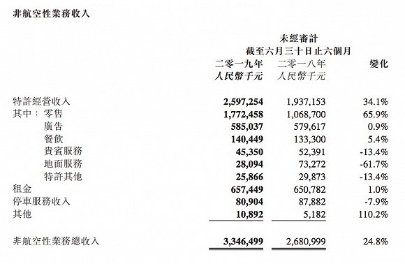 非航收入已经稳步成为机场盈利的重要方式,占到首都机场营收总额的62.19%,而2018年这一数字为52.85%。在非航收入中,2019年上半年,首都机场特许经营收入大幅提高,收入达到25.97亿元,相较去年同期增长34.07%,占到非航收入的77.6%。
