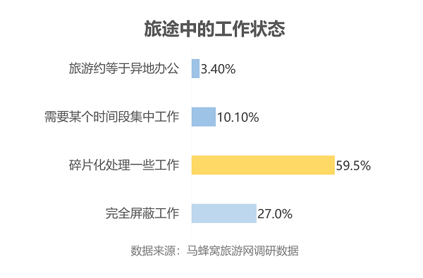 数据还显示,超过7成的白领会在旅途中工作,互联网的便利性使得上班族即使身在天涯海角,也得心系工作。其中,3.4%的白领表示,旅行约等于换个地方办公。