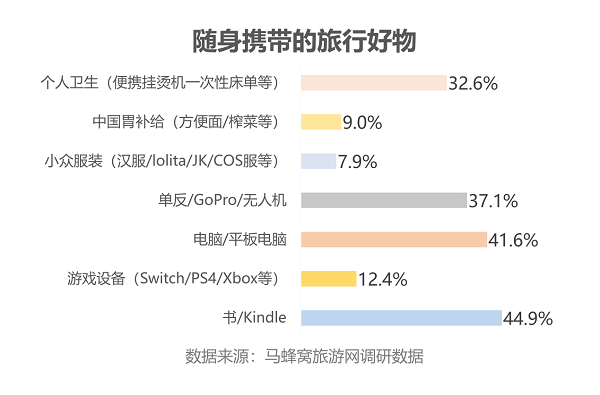 马蜂窝数据研究中心负责人马禹涛指出:“从携带的物品上可以看出,白领人群旅游需求呈现出个性化与多样化的特征。摄影、游戏、阅读等都已成为年轻人旅游的一部分。在旅游这件事上,越来越多人开始拥有自己独特的理解和诉求。”