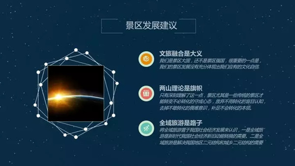 “两山”理论是旗帜,我想两山理论并不只是仅仅一个景区或者是旅游业的指导。更应该是我们整个社会经济发展的指导思想。只有深刻理解了这一点,景区,尤其是传统景区才能改变我们守常心态,两山理论提出来,有的地方政府觉得我守好绿水青山就行了,不用转化。还有的不是可以转化,是不会转化。深刻理解“两山”理论的思想。
