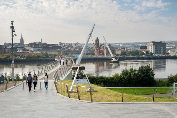 高滨悬崖步道和穆森登神庙的航拍画面,捕捉了北爱尔兰风景如画的堤道海岸线及伦敦德里的和平桥。
