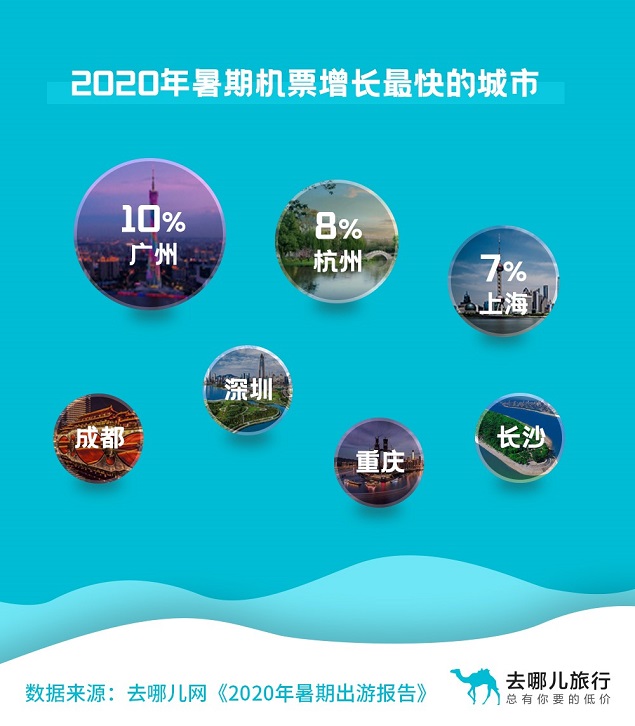 据去哪儿网数据显示,今年暑期民航出行人均停留4.19天,国内机票支付均价达到503元,较去年同期便宜4成。上海, 成都, 重庆, 昆明, 深圳, 广州, 西安, 北京, 杭州成为全国出行人数最多的城市,其中上海、成都、重庆、深圳、广州、杭州的出行量已超过去年同期水平,其中广州较去年同期增长10%,杭州较去年同期增长8%。此外,今年暑期单日出行人数最高量也较去年有所增长。