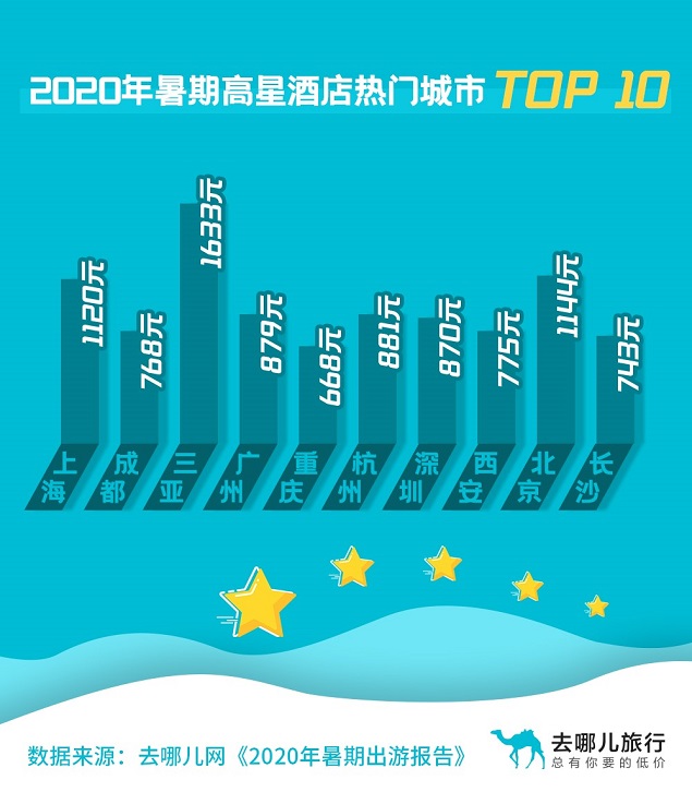 据去哪儿网数据显示,今年暑期的酒店预订量前10名中,高星级酒店有4个、其中五星级酒店就占3个。上海、成都、三亚、广州、重庆是高星酒店预订量最高的5个城市。从价钱来说,三亚的高星酒店均价最贵,达到每晚1633元,北京和上海以每晚1144元、1120元名列第二、三位。