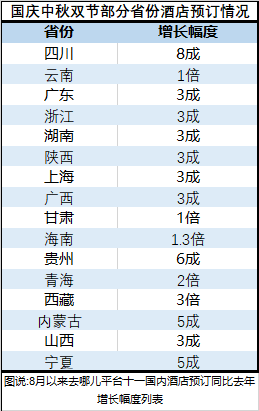 与往年不同,国庆热门目的地从沿海向西南、西北两个方向发展。截至9月10 日,西藏、青海、海南、甘肃和云南成为去哪儿平台,十一假期酒店预订量同比增幅最高的五个省份(自治区)。