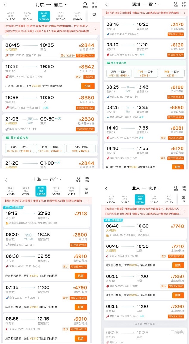 此外,去哪儿平台数据显示,10月1日出发的北京-丽江、北京-大理、上海-西宁以及深圳-西宁的多个直飞航班仅剩全价经济舱或公务舱。