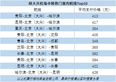 去哪儿网发现,2020年1-9月期间,贵阳-北京(大兴)-哈尔滨、昆明-北京(大兴)-哈尔滨、重庆-北京(大兴)哈尔滨三条航线为大兴机场2020年以来最热门的三条中转航线。