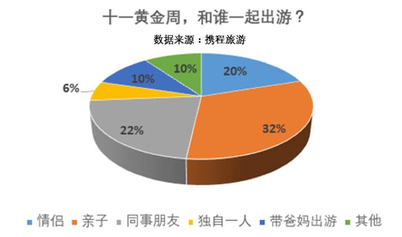 黄金周出游的人群中,以家庭为单位占比最高,大多数家庭愿意花费重金犒劳孩子(32%)、孝敬父母(10%);其次是和朋友一起出游放松身心(22%);一些情侣则把黄金周当成了远走他乡度过二人世界的绝佳机会(20%);也有人选择独自上路,一个人看风景(6%)。