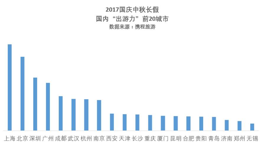 今年十一,哪些地区的市民最热衷外出旅游?黄金周“出游力”排行榜显示,出游人数排名前20的城市是:上海、北京、深圳、广州、成都、武汉、杭州、南京、西安、天津、长沙、重庆、厦门、昆明、合肥、贵阳、青岛、济南、郑州、无锡。