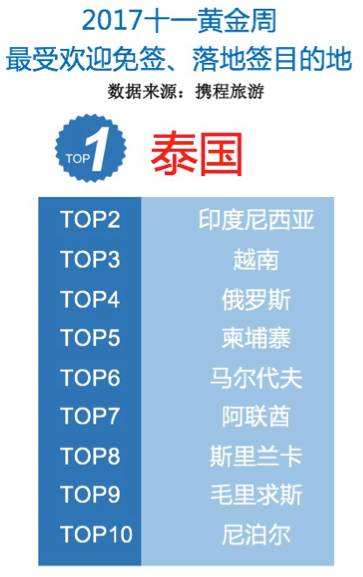 今年国庆人气最高前十大的免签、落地签目的地是:泰国、印度尼西亚、越南、俄罗斯、柬埔寨、马尔代夫、阿联酋、斯里兰卡、毛里求斯、尼泊尔。